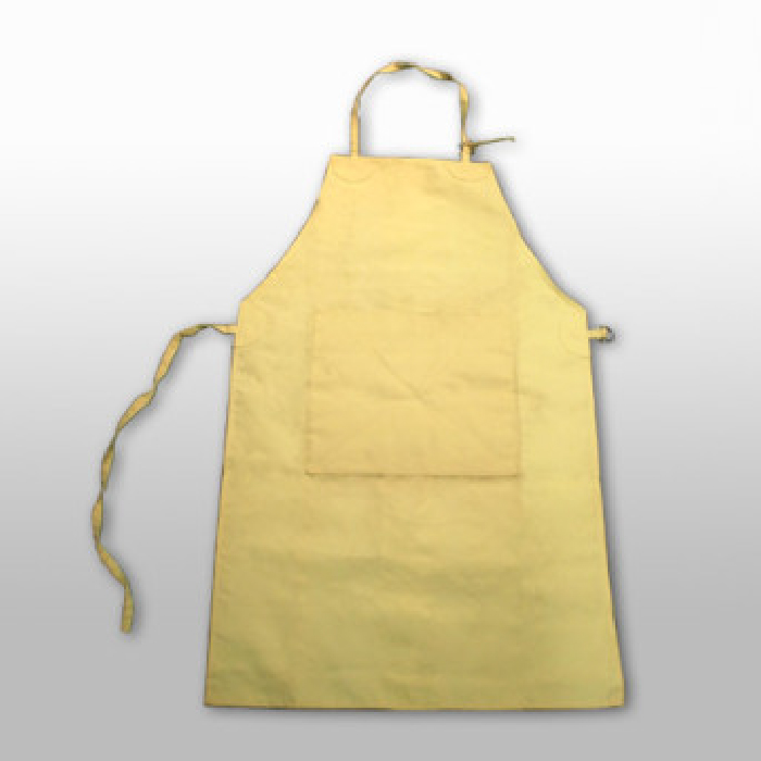 Delantal de 0,80 x 0.50 metros confeccionado con hilo de kevlar y tela Kevlar. Con pespunte simple en todo el contorno y atraques en presillas, tiras con herraje metálico tipo media luna para ajuste y refuerzo con pespunte en forma de cruz.