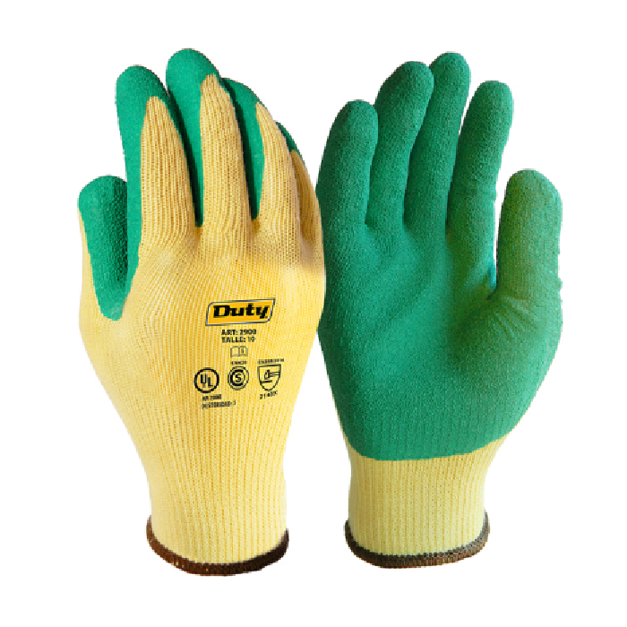 Guante tejido de poliéster GALGA 10 con baño de látex rugoso en palma y punta de dedos.