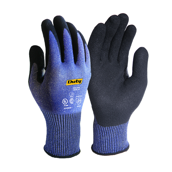 Guante de corte con un hilado especial extra fino (HPPE) tipo segunda piel. Con baño de Nitrilo espumado no respirable (impermeable) y refuerzo en Nitrilo suave entre índice y pulgar.