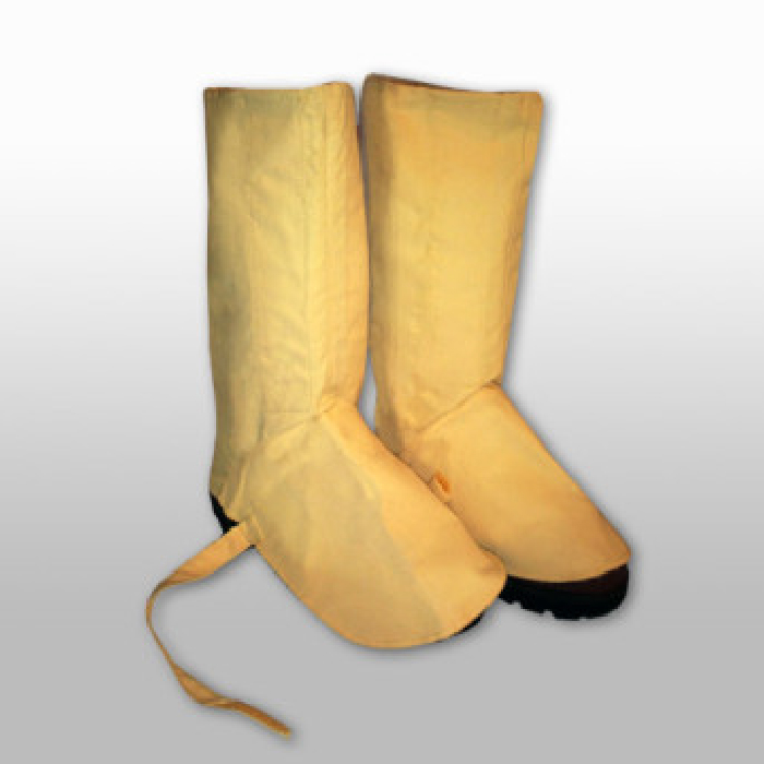 Polaina confeccionada con hilo de kevlar en tela de Kevlar 100%. Canilla y puntera reforzada con tres capas de kevlar y sulfilada. Costura tipo pespunte simple en el contorno de la canilla y cierre de contacto tipo velcro de 4 cm de ancho.